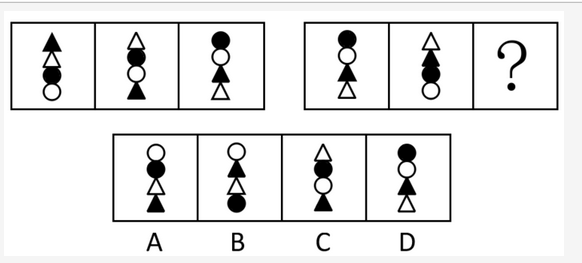 元素组成相同,考察位置规律。第一组图形的变化规律是后图在前图的基础上每个元素依次上挪1格。第二组图形中后图是前图按以下规律变化的:从顶部开始各个元素依次上挪2格、2格、1格、3格。故正确答案为A。