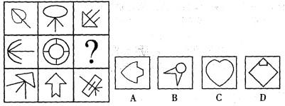 本题属于属性类问题。题干的这个九宫格图形每幅图都是轴对称图形,而且它们的对称轴可 以组合成一个“米”字形状。要求的这幅图应该是个横轴对称的图形,只有A符合要求。所以选择A选项。