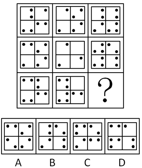 本题考点为元素叠加中的叠加运算。元素组成相似,是判断本考点的依据。按照对角线、横轴、竖轴(成“米字型”),去异存同叠加运算,均得到中心图形。故正确答案为D。