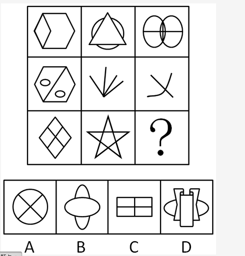 元素组成凌乱,考数数。本题考察数直线。已知图形第一列图形的直线数分别是8、7、6,第二列图形的直线数分别为3、4、5,因此第三列图形的直线数分别为2、1、0,此时按纵向S型规律来看,图形直线数为8、7、6、5、4、3、2、1、0。通过分析,只有B项中图形没有直线。故正确答案为B。