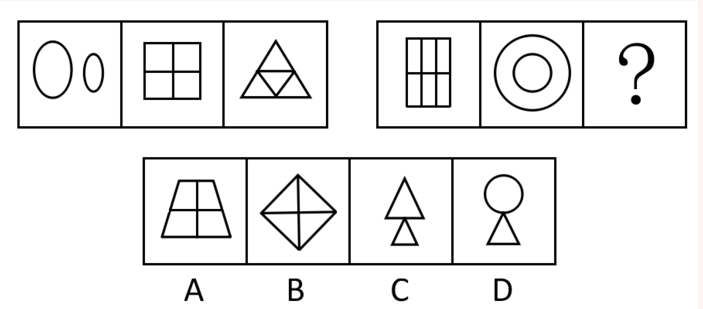 B从每行或每列来看,都含有1个上下结构、1个左右结构、1个包围结构的汉字,由此问号处应选择一个上下结构的汉字,答案为B。