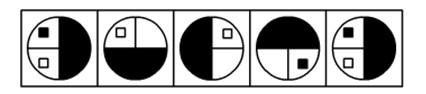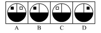 【思路点拨】这是一道图形综合旋转规律题。通过观察图形中的五个给出图形我们可以发现,在一个四等分圆中,各图形中黑色的半圆依次逆时针旋转90°,白色的小方块依次顺时针移动一个区域,黑色的小方块在四等分圆的二、四象限交替出现,其中当色块重叠时,各色块之间会进行覆盖,黑色块会覆盖白色块。依照这个规律对第五个给出图中的各色块进行移动,得到的新图形应该为C选项。故选择C选项。