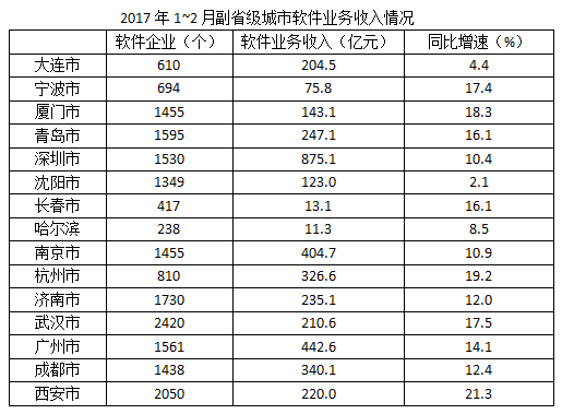 2017年1~2月,我国副省级城市实现软件业务收入3874亿元,同比增长12.9