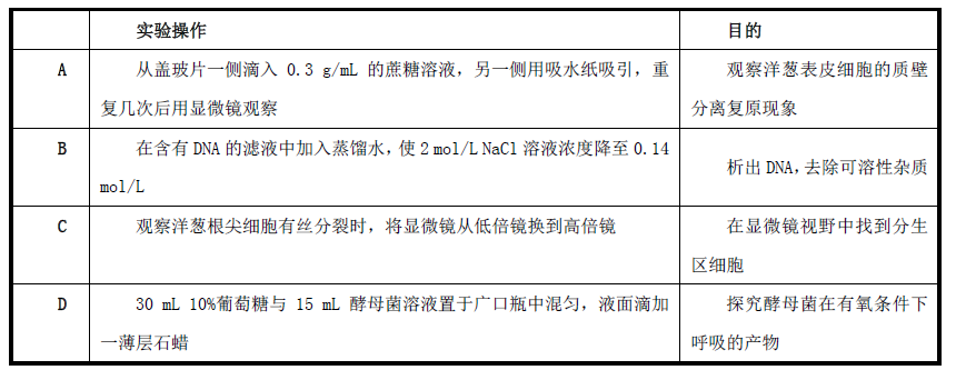 滴加0.3g/ml蔗糖溶液,观察的是质壁分离实验,A不符合;观察细胞有丝分裂,低倍镜转化到高倍镜的目的是观察细胞有丝分裂各时期的特点,C不符合;在液面滴加一薄层石蜡是为了阻绝外界空气,探究酵母菌子啊无氧条件下的产物,D不符合。故选B。