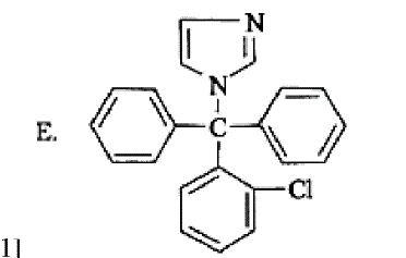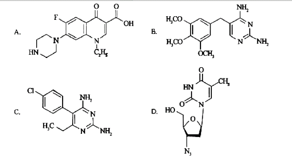[解析]本组题考查药物结构式及作用机制。D项为齐多夫定结构式,齐多夫定为胸苷的类似物,在其脱氧核糖部分的3位上以叠氮基取代,它可以对能引起艾滋病病毒和T细胞白血病的RNA肿瘤病毒有抑制作用,为抗逆转酶病毒药物。C项为乙胺嘧啶,依据2,4-二氨基嘧啶能抑制疟原虫的二氢叶酸还原酶,设想这类衍生物也可能有抗疟活性,发现乙胺嘧啶(Pyrimethamine)及硝喹(Nitroquine)均对疟疾具有较好的预防和治疗作用。乙胺嘧啶为二氢叶酸还原酶抑制剂,使核酸合成减少,通过抑制细胞核的分裂,使疟原虫的繁殖受到抑制。本品主要用于预防疟疾。其特点是作用持久,服药一次作用可维持一周以上。为了杀灭耐乙胺嘧啶虫株,近年来国外将乙胺嘧啶和二氢叶酸合成酶抑制剂磺胺多辛(半衰期为140小时))一起组成复合制剂,则可起到双重抑制作用。B项为甲氧苄啶,本品与磺胺类药物,如磺胺甲噁唑或磺胺嘧啶合用,可使其抗菌作用增强数倍至数十倍。甚至有杀菌作用。而且可减少耐药菌株的产生。还可增强多种抗生素(如四环素、庆大霉素))的抗菌作用。由于人和动物辅酶F的合成过程与微生物相同,而甲氧苄啶对人和动物的二氢叶酸还原酶的亲和力要比对微生物的二氢叶酸还原酶的亲和力弱100W—60000倍,所以它对人和动物的影响很小,其毒性也较弱。E项为克霉唑,唑类抗真菌药物可抑制真菌细胞色素P450。P450能催化羊毛留醇14位脱a-甲基成为麦角甾醇,唑类药物抑制甾醇14a-脱甲基酶,导致14-甲基化甾醇的积累,诱导细胞通透性发生变化,膜渗透细胞的结构被破坏,继而造成真菌细胞的死亡。