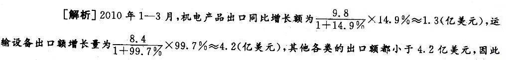 增长量肯定小于4. 2亿美元,因此同比增长最多的是运输设备,故正确答案为A。