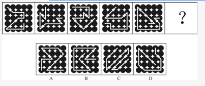 第一步,观察特征。每个图形均由25个黑点和1条白线组成,白线串起黑点个数不一致,考虑数黑点个数。第二步,一条式,从左到右找规律。题干图形中都有一根白线,白线串起黑点的个数分别为:12、13、14、15、16、?,问号处白线串起黑点的个数应该为17,只有A项符合。因此,选择A选项。
