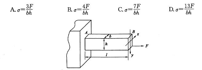 图示矩形截面杆AB,A端固定,B端自由。B端右下角处承受与轴线平行的集中力F,杆的最大正应力是: