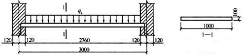 某简支在砖墙上的现浇钢筋混凝土平板(见图),板厚h=100mm,as=20mm。