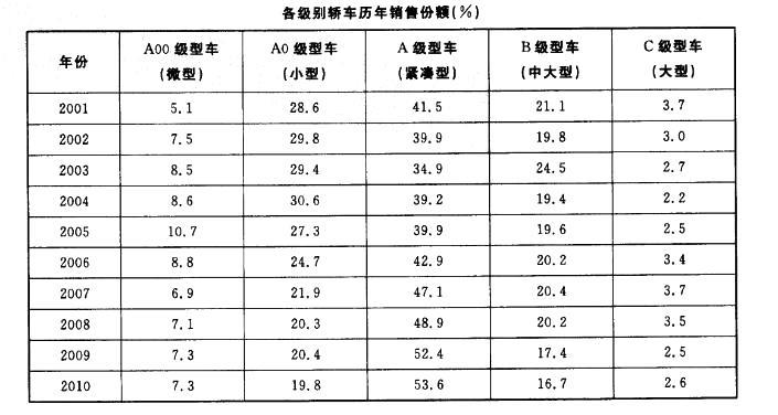 2006-2010年,A0级型车平均每年销售份额比A00级型车高(24. 7 + 21.9 + 20. 3 + 20. 4+19. 8-8. 8-6. 9-7.1-7. 3-7. 3)/5≈14 个百分点。故正确答案为 A。