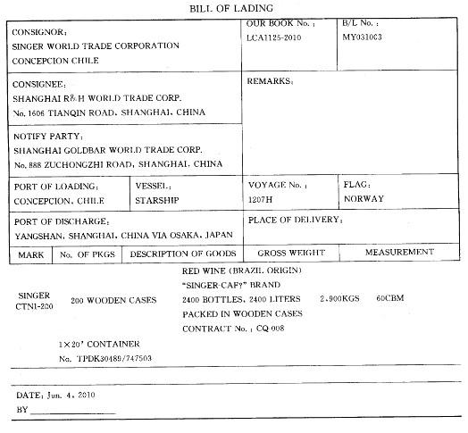 某公司从智利进口一批红酒,请根据所提供的单据,完成相关的判断题。 该批