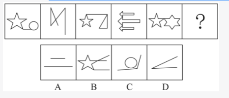 第一步,观察特征。组成元素不同,优先考虑数量类或属性类。出现考查一笔画的特征图形五角星,考虑笔画数。第二步,一条式,从左到右找规律。题干所给图形均能一笔画出,所以问号处应选择一笔画图形,只有D项符合。因此,选择D选项。