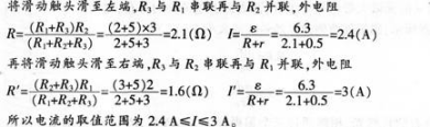 案例: 下面是一道习题和某学生的解答。 如图所示电路,已知电源电动势8=6.3v,内电阻r=0.5Ω,固定电阻R1=2Ω,R2=3Ω,R3是最大阻值为5Ω的滑动变阻器,按下电键K,调节滑动变阻器的触点.求通过电源的电流范围。