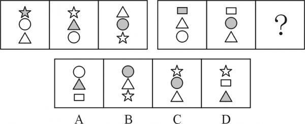 A. 如上图所示 B. 如上图所示 C. 如上图所示 D. 如上图所示A本题考查图形的元素的组成,前一组图形中均由3种相同的元素组成,后一组满足相同的规律