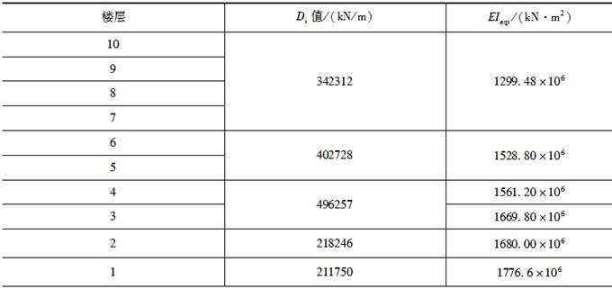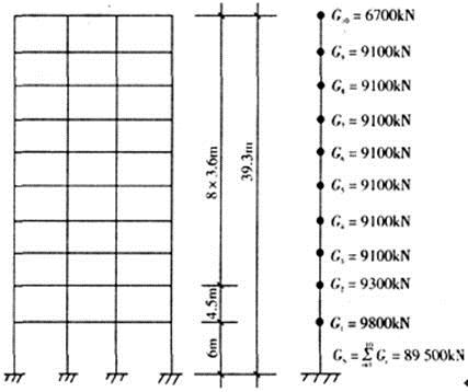 10层框架—剪力墙结构,抗震设防烈度为8度,Ⅱ类场地,设计地震分组:第一组。首层层高6m,2层层高4.5m,3~10层层高3.6m,总高度39.3m。质量和刚度沿高度分布比较均匀,各楼层重力荷载代表值Gi如图所示。各楼层框架的Di值及剪力墙等效刚度如表6-5所列。采用侧移法计算在连续均布荷载作用下结构假想顶点位移μT=ψuqH4/100EIw,并已知当结构刚度特征值λ=1.2时位移系数ψu=8.07。结构阻尼比ζ=0.05。