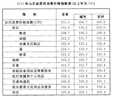 初步核算,2011年,山东省实现生产总值(GDP)45429. 2亿元,比上年增长10.9%。其 中,第一产业增加值3973.8亿元,增长4.0% ;第二产业增加值24037. 4亿元,增长11. 7% ;第三产业增加值17418.0亿元,增长11. 3%。产业结构调整稳步推进,三次产业比例由上年的 9. 2 : 54. 2 : 36. 6 调整为 8. 8 : 52. 9 : 38. 3。人均生产总值 47260 元,增长 9.9%。物价总水平得到有效调控。居民消费价格月度指数呈现“倒V型”走势,全年居民消费价格上涨5. 0%。其中,城市上涨4. 7%,农村上涨5. 9%;服务项目价格上涨3. 5%,消费品价格上涨5.6%。八大类商品和服务项目价格全面上涨。其中,食品类价格上涨11.3%,拉动价格总水平上涨3. 2个百分点,仍是居民消费价格上涨的主要因素;居住类价格上涨5. 8%,拉动 价格总水平上涨1.1个百分点。农业生产资料价格上涨11.1%。工业生产者出厂价格上涨 6. 0%,工业生产者购进价格上涨9. 2%。