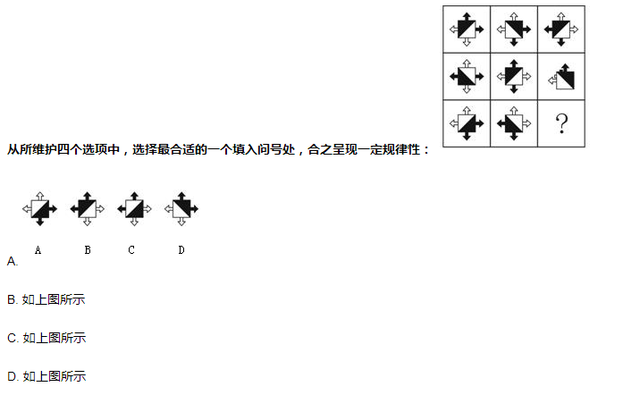AA本题考查的是位置类,第一行第一个图形阴影部分顺时针旋转90°,然后将第二个图形以数轴翻转得到第三个图形,第二行检验规律,因此,得出本题答案A