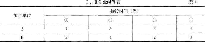 某城市新建主干道,长2.5km,设双向四车道,路面组成结构如下:20cm石灰稳定碎石底基层,38cm水泥稳定碎石基层,8cm粗粒式沥青混合料下面层,6cm中粒式沥青混合料中面层,4cm细粒式沥青混合料表面层。施工机械主要有:挖掘机、铲运机、压路机、洒水车、平地机、自卸汽车。底基层直线段由中间向两边,曲线段由外侧向内侧碾压,沥青混合料摊铺时随时对温度进行检查,轮胎压路机初压速度为1.5~2.0km/h。施工现场公示牌设置为:工程概况牌、安全生产牌、文明施工牌,安全纪律牌。施工分为Ⅰ、Ⅱ、Ⅲ、Ⅳ、Ⅴ5个部分,Ⅰ、Ⅱ作业时间如表1所示,Ⅲ、Ⅳ、Ⅴ作业均为1周。