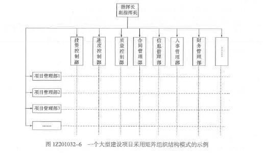 教材P20 在矩阵组织结构中,每一项纵向和横向交汇的工作(如图1Z201032-6所示的项目管理部涉及的投资问题),指令来自于纵向和横向两个工作部门,因此其指令源为两个