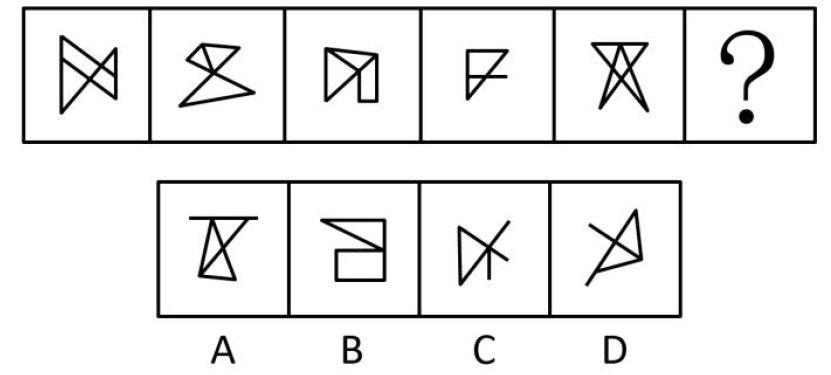 图形元素组成不同,且无明显属性规律,优先考虑数量规律。观察发现,图五出现“五角星”变形图,图四、选项C、D中出现了多端点图形,考虑笔画数。图一有2个奇点,图二有2个奇点,图三有2个奇点,图四有2个奇点,图五有0个奇点,题干中图形均为一笔画图形,所以“?”处应为一笔画图形。A项两笔画,B项一笔画,C项两笔画,D项两笔画。